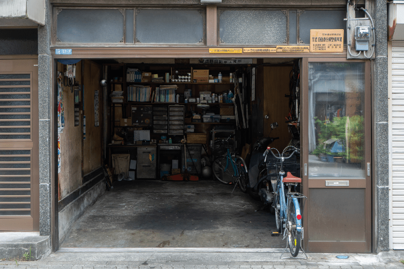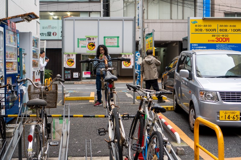 As with cars—see below—bikes are parked in every possible nook, slid into gaps and sidling up alongside façades, again ensuring the street, or passageway, is left clear and open. They often become part of the informal assemblages of objects—plants, storage boxes, chairs, signs, stools, air conditioning units—that line the property boundaries of buildings. Being Japan, there are of course hi-tech commercial services for bike parking, like these well-publicised underground bike parking ‘robots’, but I’m more interested in the informal adaptive design of the following approaches.